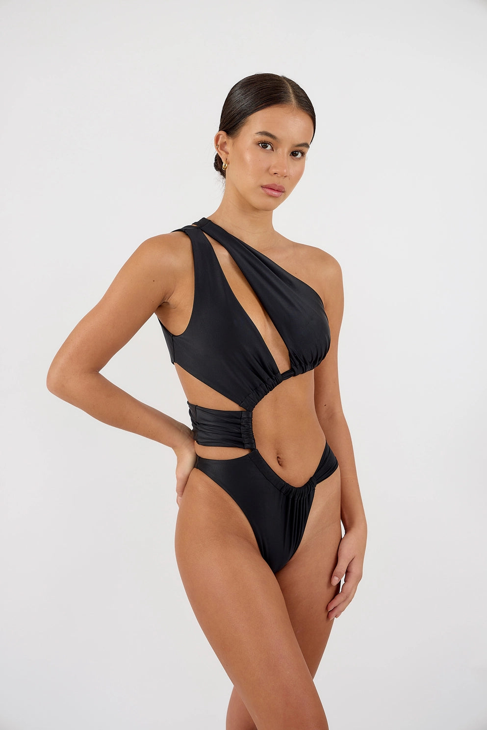 Crafted from premium stretch fabric, it features an asymmetric neckline and artfully placed panels that create a distinctive silhouette without compromising coverage or comfort.